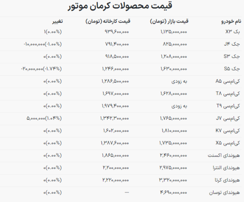 قیمت محصولات کرمان موتور در بازار آزاد و کارخانه