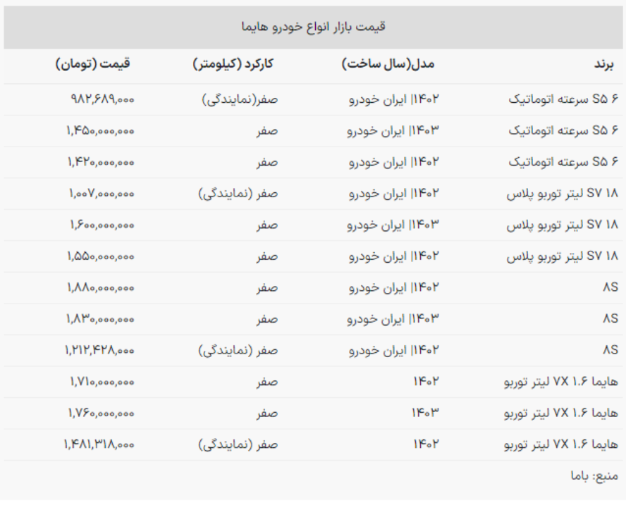با مطالعه جدول زیر اطلاعات کاملی درباره قیمت روز خودروهای هایما به دست خواهید آورد:
