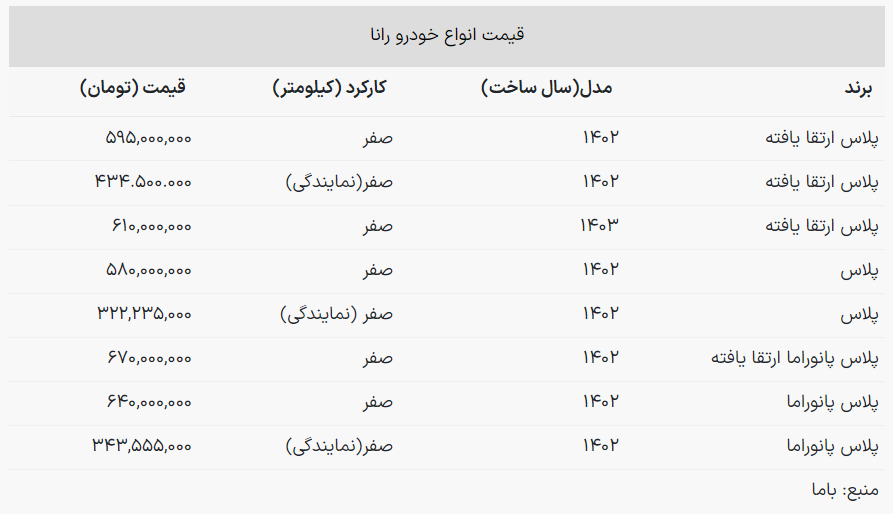 با مطالعه جدول زیر اطلاعات بیشتری درباره قیمت روز خودروهای رانا به دست خواهید آورد: