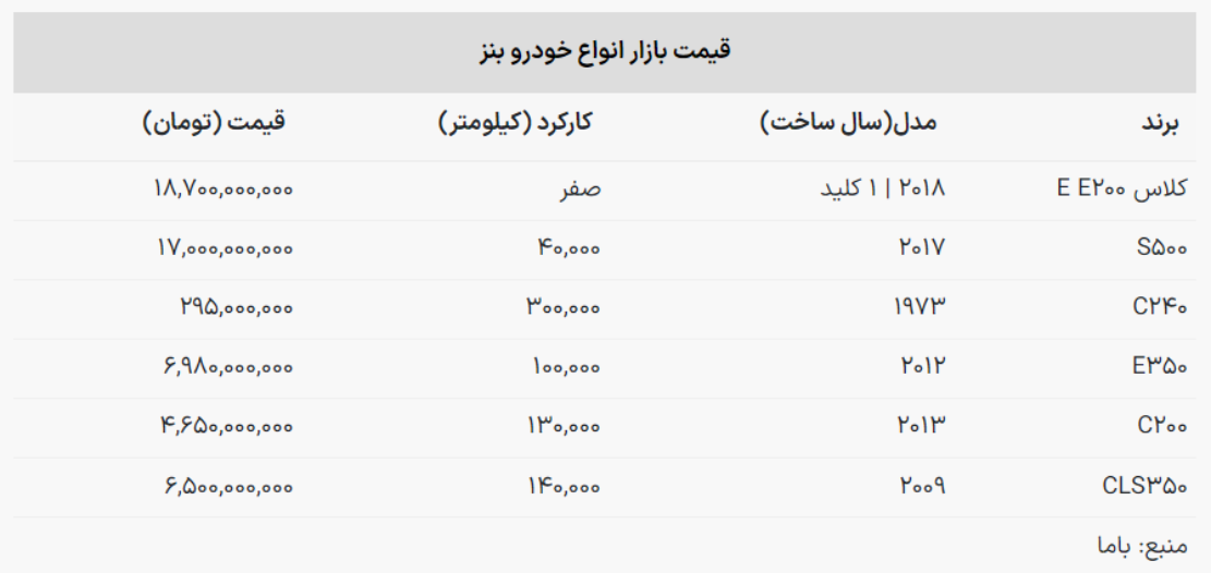 با مطالعه جدول زیر اطلاعات کاملی درباره قیمت روز انواع خودروهای بنز در بازار به دست خواهید آورد: