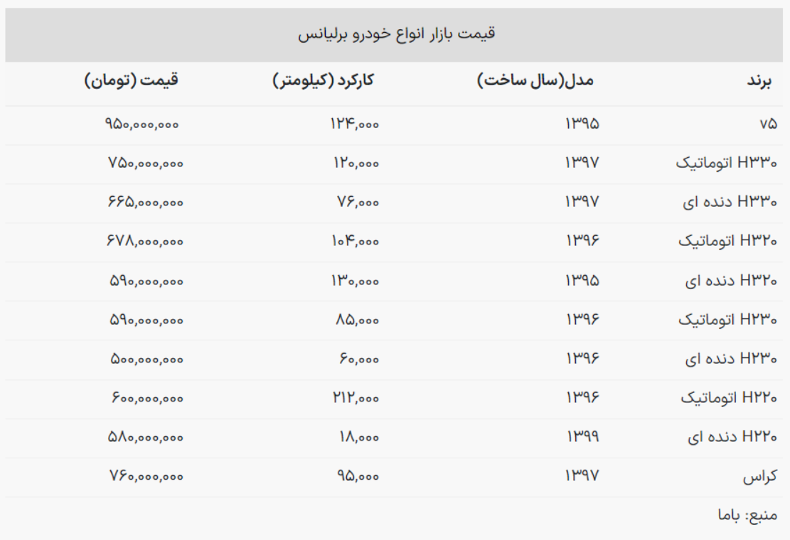 با مطالعه جدول زیر اطلاعات کاملی درباره قیمت روز انواع خودروی برلیانس به دست خواهید آورد: