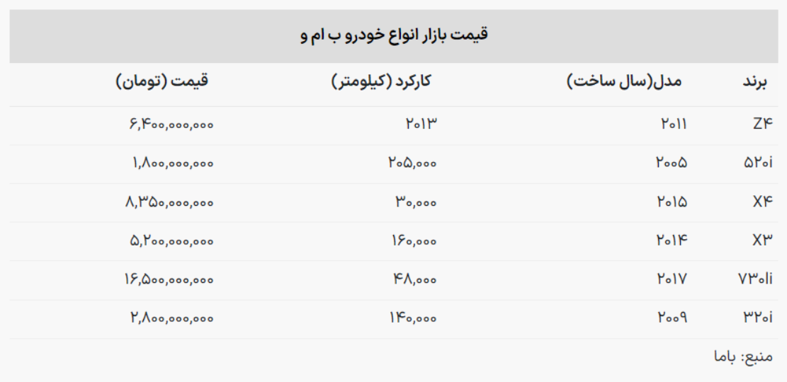 با مطالعه جدول زیر اطلاعات کاملی درباره قیمت روز خودروهای BMW به دست خواهید آورد: