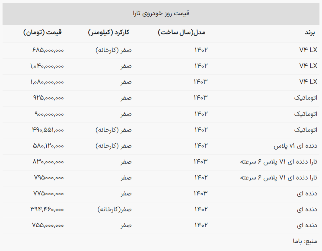 قیمت تارا اتوماتیک V۴ LX مدل ۱۴۰۳ یک میلیارد و ۸۰ میلیون تومان شد.