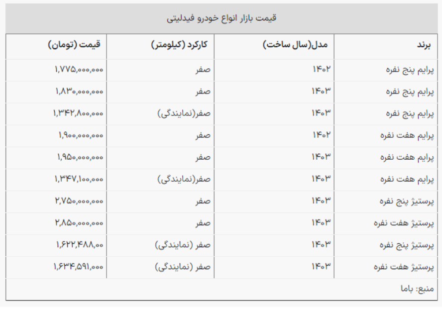 همچنین قیمت فیدلیتی پنج نفره مدل ۱۴۰۳ در بازار با کاهش ۴۰ میلیونی ۱ میلیارد و ۸۵۰ میلیون تومان شد.