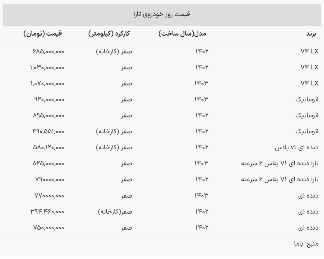 با مطالعه جدول زیر اطلاعات کاملی درباره قیمت روز انواع خودروی تارا به دست خواهید آورد: