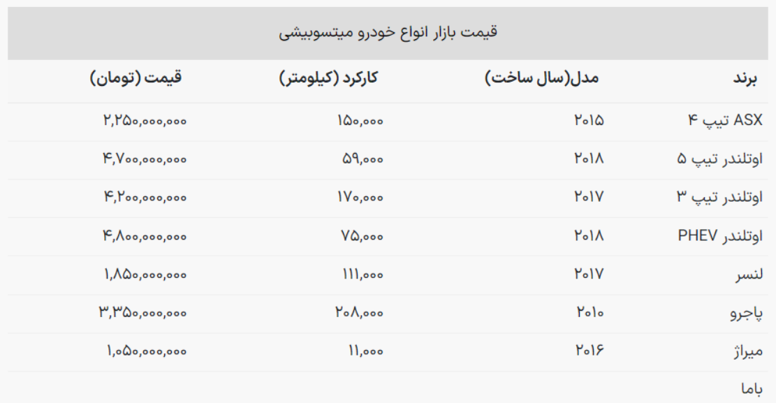 با مطالعه جدول زیر اطلاعات کاملی درباره قیمت روز خودروهای میتسوبیشی به دست خواهید آورد:
