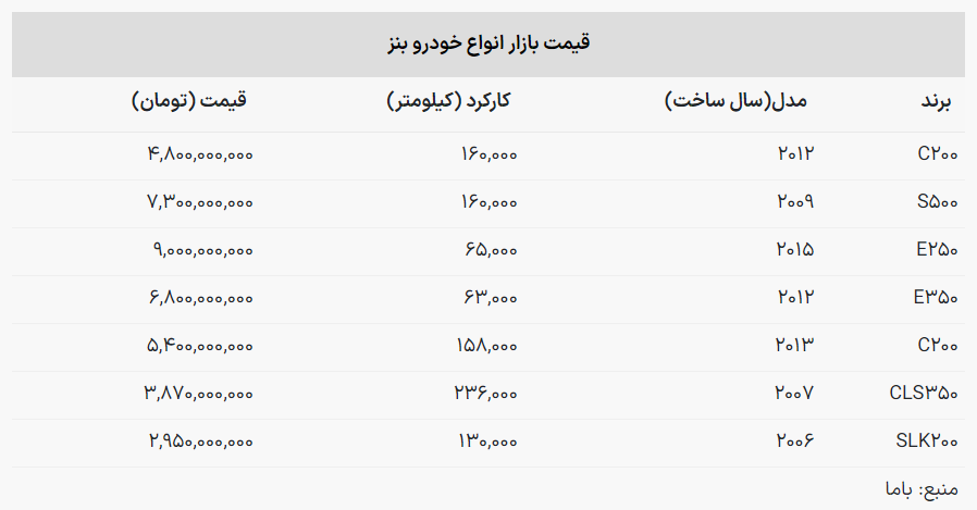 با مطالعه جدول زیر اطلاعات کاملی درباره قیمت روز انواع خودروهای بنز در بازار به دست خواهید آورد: