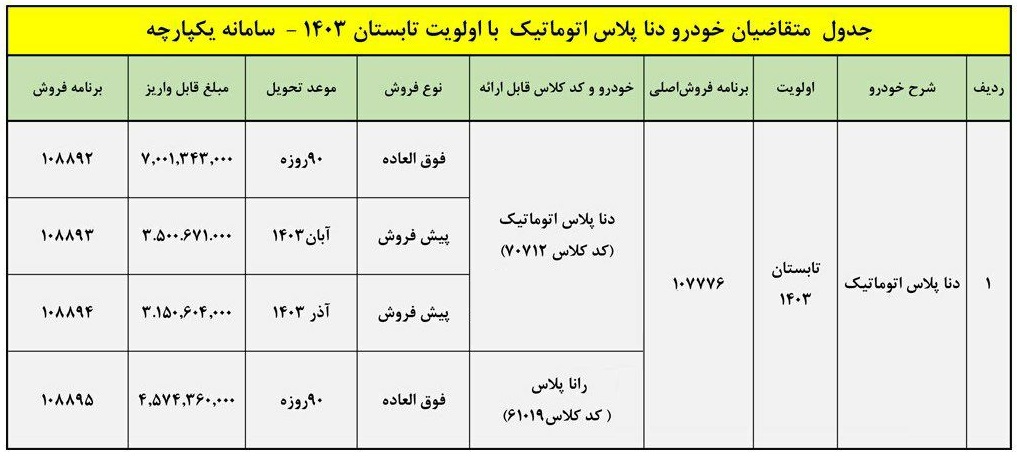ایران جیب/ به استحضار میرساند شرایط انتخاب و واریز وجه به تعداد محدود برای متقاضیان خودرو دنا پلاس اتوماتیک با اولویت تابستان 1403 سامانه یکپارچه مطابق جدول پیوست ایجاد شده است. لذا متقاضیان فوق میتوانند طی مدت 10 روز یا زمان تکمیل ظرفیت با مراجعه به سایت فروش اینترنتی ایران خودرو نسبت به واریز وجه اقدام نمایند.