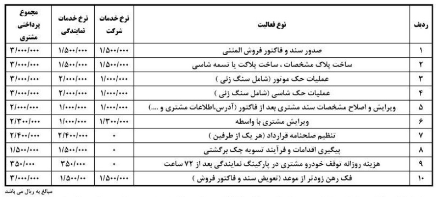 ایران جیب/ بدینوسیله به اطلاع کلیه نمایندگیهای ایران خودرو میرساند با توجه به رویکرد شرکت در خصوص رضایتمندی نمایندگیها در راستای ارائه خدمات مناسب مشتریان نرخهای ارائه خدمات در بخشنامه ۴۳۵۱ مورد بازنگری قرار گرفته است و نمایندگیهای محترم میتوانند از تاریخ ارسال این بخشنامه نسبت به ارائه خدمات به مشتریان مطابق با نرخهای جدید در جدول ذیل اقدام نمایند.