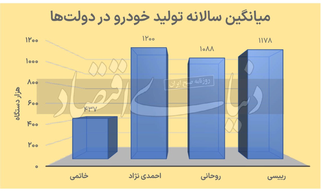 از دولت احمدینژاد بهبعد، میانگین سالانه تولید در یک مسیر عمودی قرار گرفته است، بهطوریکه در دولت روحانی (دولتهای یازدهم و دوازدهم) نیز میانگین سالانه تولید یکمیلیون و ۸۸هزار دستگاه بوده است. در دولت رئیسجمهور فقید، ابراهیم رئیسی، نیز میانگین تولید به یکمیلیون و ۱۷۸هزار دستگاه رسیده است. آنچه مشخص است میانگین سالانه تولید در دولتهای هفتم و هشتم (سیدمحمد خاتمی) اگر چه کمتر از دیگر دولتها بوده اما در این دوره اتفاقات زیربنایی در صنعت خودروی کشور رخ داد که در ۴۰سال گذشته، نمونههایی از آن رخ نداده بود.