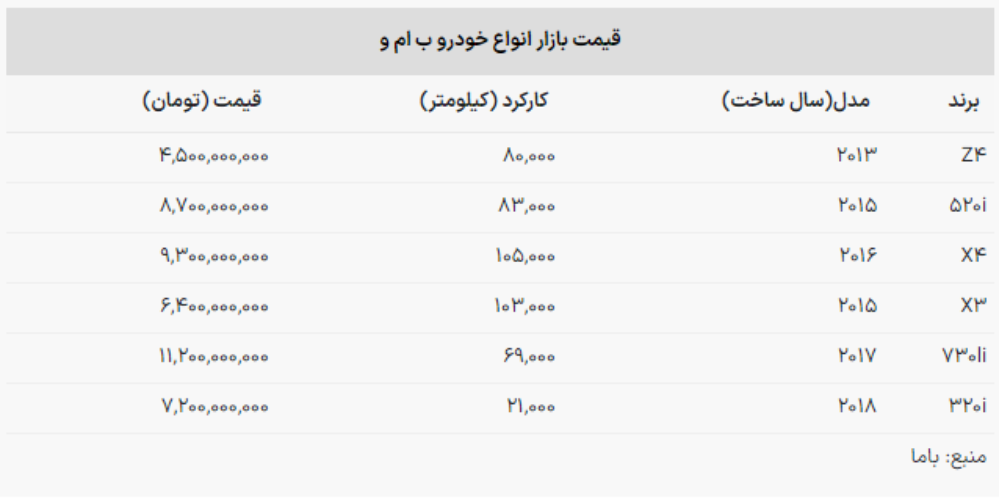 با مطالعه جدول زیر اطلاعات کاملی درباره قیمت روز خودروهای BMW به دست خواهید آورد:
