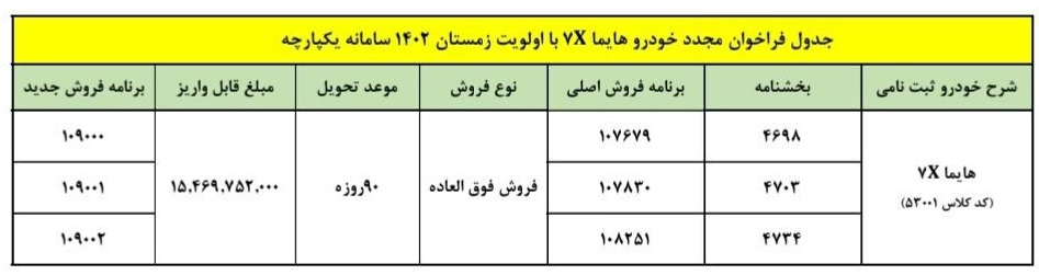 ایران جیب/ شرایط انتخاب و واریز وجه مجدد به تعداد محدود برای بخشی از متقاضیان خودروی هایما 7 ایکس با اولویت زمستان 1402 سامانه یکپارچه مطابق جدول پیوست ایجاد شده است. متقاضیان فوق میتوانند طی مدت ۱۰ روز یا زمان تکمیل ظرفیت با مراجعه به سایت فروش اینترنتی ایران خودرو نسبت به ثبت نام اقدام نمایند.