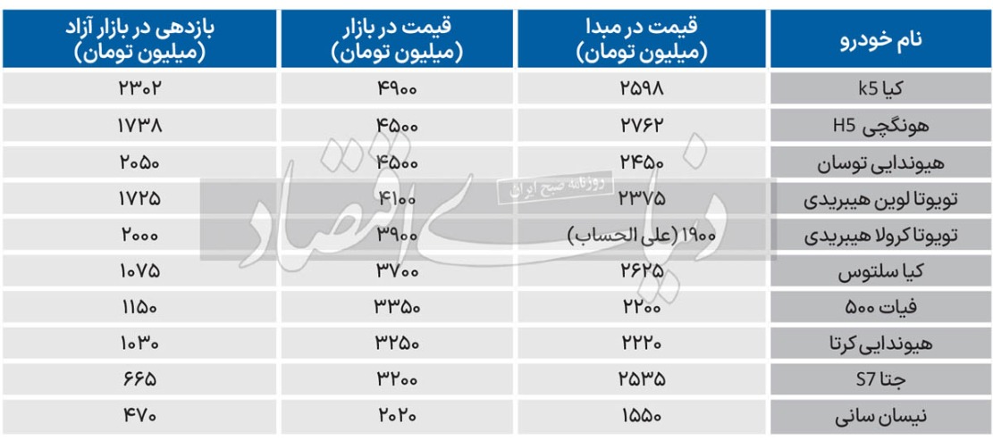 یا مثلا خودروی چینی هونگچی که در نمایندگی زیر دومیلیارد و 800میلیون تومان قیمت دارد، در بازار آزاد از قیمت حدودا چهارمیلیارد و 500میلیون تومانی برخوردار است.خودروی دیگر به نام هیوندای توسان، در مبدا دومیلیارد و 450میلیون تومان قیمت دارد، اما برای خرید آن از بازار باید چهارمیلیارد و 500میلیون تومان هزینه کرد. خودرویی چینی به نام جتا S7 که در نمایندگی زیر دومیلیارد و 550میلیون تومان قیمت دارد، در بازار آزاد سهمیلیارد و 200میلیون تومان ارزشگذاری شده است. در بین 10خودرویی که مورد بررسی قرار داده ایم، کمترین حاشیه بازار به نیسان سانی مربوط میشود و بیشترین اختلاف قیمت کارخانه و بازار نیز نصیب کیا K5 شده است.