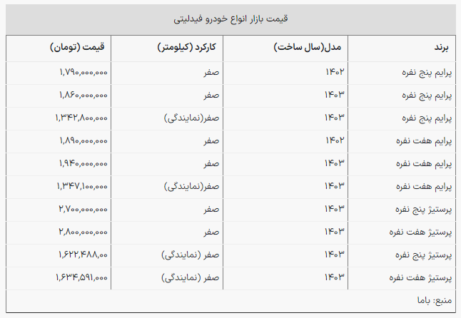 همچنین قیمت فیدلیتی پنج نفره مدل ۱۴۰۳ در بازار با افزایش ۱۰ میلیونی ۱ میلیارد و ۸۶۰ میلیون تومان شد.