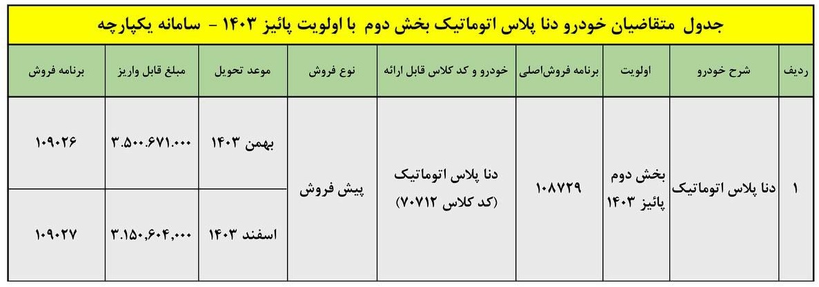 ایران جیب/ به استحضار میرساند شرایط انتخاب و واریز وجه به تعداد محدود برای متقاضیان خودرو دنا پلاس اتوماتیک با اولویت پاییز 1403 سامانه یکپارچه مطابق جدول پیوست ایجاد شده است. لذا متقاضیان فوق میتوانند طی مدت 10 روز یا زمان تکمیل ظرفیت با مراجعه به سایت فروش اینترنتی ایران خودرو نسبت به واریز وجه اقدام نمایند.