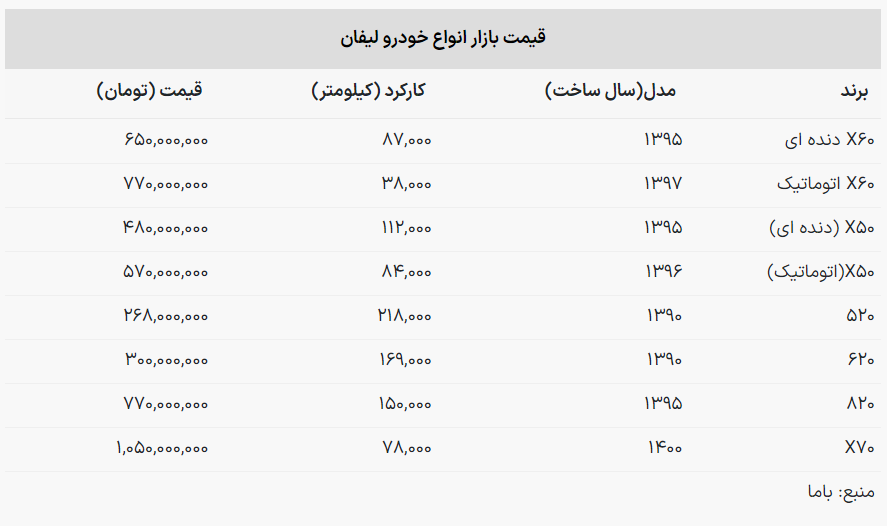 با مطالعه جدول زیر اطلاعات بیشتری درباره قیمت روز خودروهای لیفان به دست خواهید آورد: