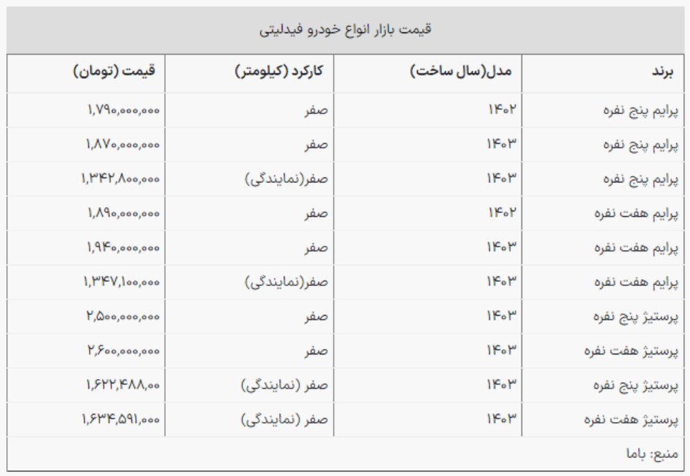 اقتصاد آنلاین/ در این گزارش به قیمت مدل های مختلف فیدلیتی در بازار و کارخانه می پردازیم.