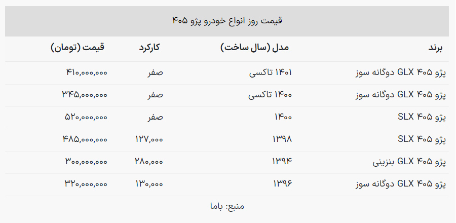 بر این اساس قیمت پژو ۴۰۵ GLX دوگانه سوز صفر، ۴۱۰ میلیون تومان قیمت خورده است.