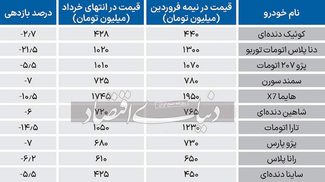 اما بیشتر خودروهای منتخب، بازدهی منفی تکرقمی داشتهاند. در این بین، کمترین میزان افت قیمت نصیب کوئیک دندهای شده که رقم منفی 2.7درصد را ثبت کرده است. قیمت این خودرو از 440میلیون تومان در نیمه فروردین به 428میلیون تومان در انتهای خرداد نزول کرده است.ساینای دندهای بنزینی نیز که در میانه فروردین 450میلیون تومان قیمت داشت، در حال حاضر 425میلیون تومان به فروش میرسد.