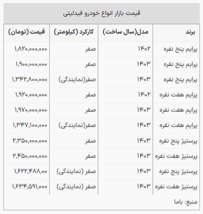 همچنین قیمت فیدلیتی پنج نفره مدل ۱۴۰۳ در بازار با افزایش ۳۰ میلیونی ۱ میلیارد و ۹۰۰میلیون تومان شد.