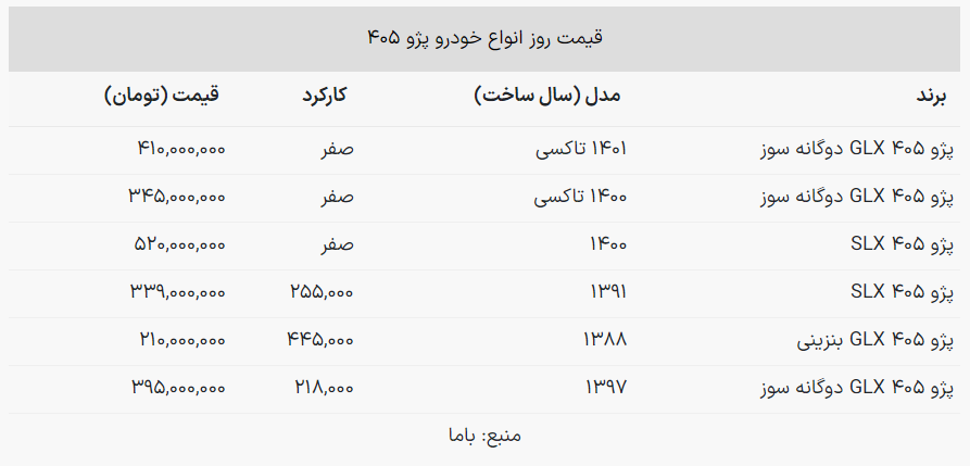 بر این اساس قیمت پژو ۴۰۵ GLX دوگانه سوز صفر، ۴۱۰ میلیون تومان قیمت خورده است.