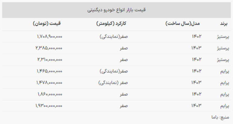 قیمت دیگنیتی صفر مدل پرستیژ ۱۴۰۳ به ۲ میلیارد و ۳۸۵ میلیون تومان رسید که این مدل در یک هفته اخیر ۱۵۵ میلیون تومان گران شده است.