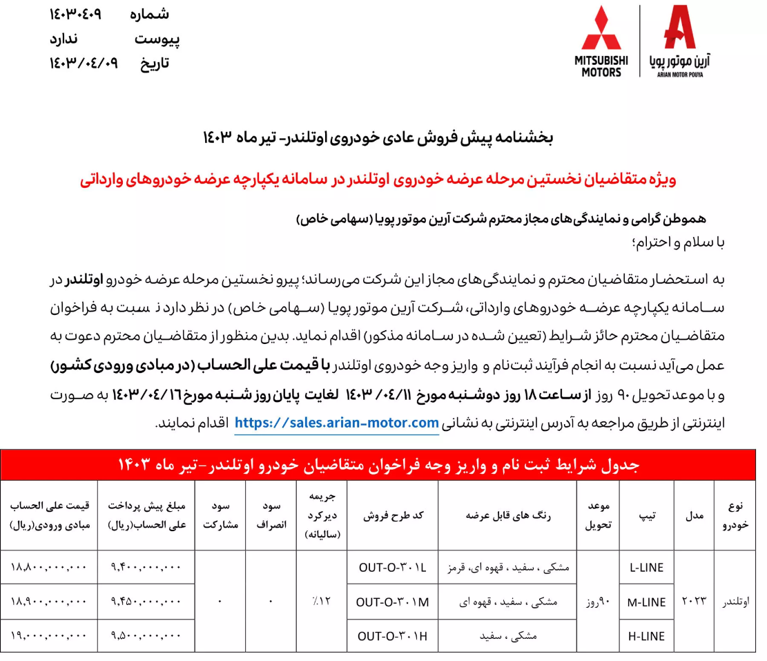 میتسوبیشی اوتلندر جدید یکی از خودروهایی بود که در آخرین عرضه سامانه خودروهای وارداتی، موجود شده بود. حالا شرکت آرین موتور شرایط فروش اوتلندر ۲۰۲۴ اعلام کرده است. بر اساس شرایط فروش منتشر شده، متقاضیانی که خودروی اوتلندر به آن ها تخصیص پیدا کرده است، از ساعت ۱۸ روز دوشنبه ۱۱ تیرماه تا شنبه ۱۶ تیرماه می توانند برای تکمیل وجه از طریق نمایندگی های رسمی آرین پارس موتور اقدام نمایند. مشتریان می بایست ۵۰ درصد مبلغ علی الحساب را پرداخت نمایند و باقی مبلغ در زمان صدور دعوتنامه و محاسبه قیمت نهایی، پرداخت خواهد شد. دقت داشته باشید که در این عرضه فقط نسخه تک دیفرانسیل در سه تریم عرضه شده است.