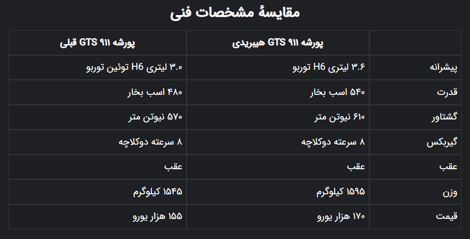 به دلیل وجود سیستم هیبریدی، طبیعی است که GTS جدید سنگینتر از قبل شده باشد اما این افزایش وزن تنها ۵۰ کیلوگرم است و حالا وزن نسخهٔ هیبریدی به ۱۵۹۵ کیلوگرم رسیده درحالیکه این عدد برای نسخهٔ قبلی ۱۵۴۵ کیلوگرم بود. هردو خودرو دیفرانسیل عقب هستند و هردو از گیربکس هشت سرعته دوکلاچه پورشه استفاده میکنند. در این مسابقه بین دو نسخهٔ ۹۱۱ کاررا GTS، مت واتسون به همراه رانندهٔ سابق فرمول یک و سفیر کنونی برند پورشه، «مارک وبر» با خودروها رانندگی میکنند.