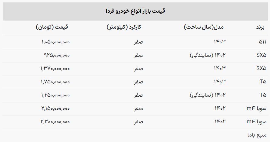قیمت کارخانه ای فردا موتورز برای سوبا M۴ صفر مدل ۱۴۰۲ یک میلیارد و ۸۵۰ میلیون تومان اعلام شده است.
