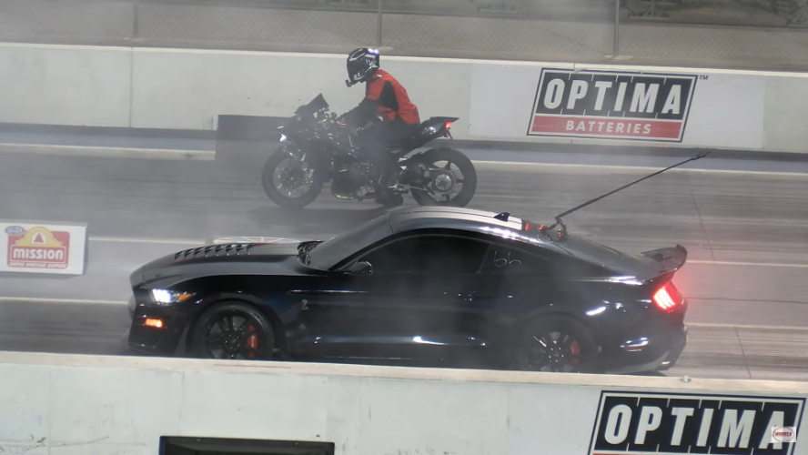 پدال/ دو خودروی عضلانی مشهور دنیا یعنی فورد موستانگ شلبی GT500 و دوج هلکت در مسابقه درگ با موتورسیکلت کاوازاکی نینجا H2R شرکت کردهاند.