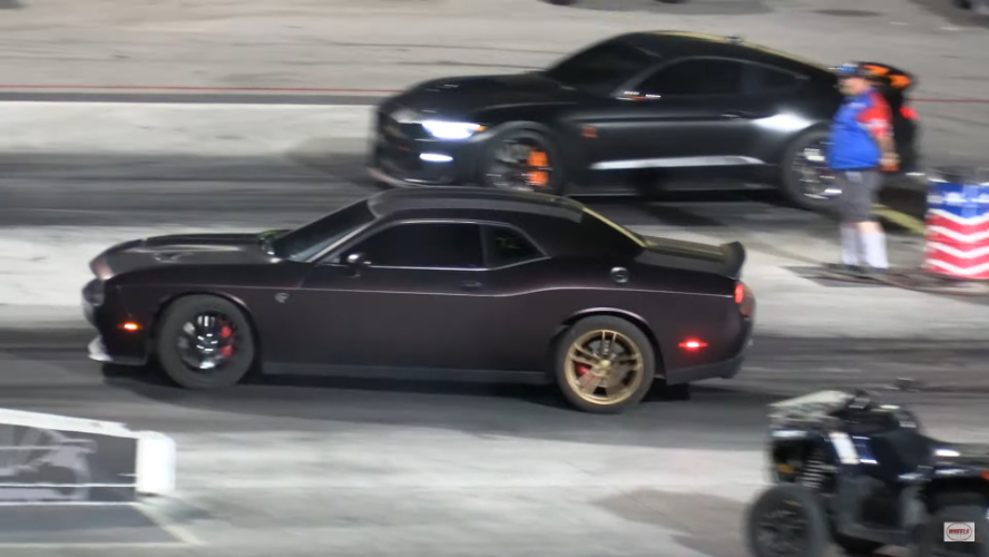 در این مسابقه درگ فورد موستانگ شلبی GT500 مشکی رنگ با تریم نارنجی به رقابت با دوج چلنجر SRT هلکت میپردازد. بیشک این دو خودرو جزو جذابترین و بهترین محصولات آمریکا هستند و پیشرانههای ۸ سیلندر ۵.۲ و ۶.۲ لیتری سوپرشارژردار آنها قدرت قابلتوجهی تولید میکند. هلکت موردبحث به لطف سقف و کاپوت خاکستری رنگ و رینگهای عقب طلایی از حالت استاندارد خارج شده و بیشتر جلبتوجه میکند. هر دو خودرو در این مسابقه رقابت فشردهای دارند و مسافت ۴۰۰ متر را در زمان سؤالبرانگیز ۱۳.۳۷ و ۱۳.۶۵ ثانیه طی میکنند. اگر فکر نمیکنید این دو خودرو کند بودهاند باید یادآوری کنیم که قبلاً عملکرد بسیار بهتری را از این خودروها دیدهایم.