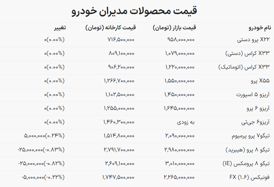 بر اساس جدیدترین قیمت محصولات مدیران خودرو، قیمت ام وی ام X۲۲ پرو دستی به ۹۵۸ میلیون تومان رسیده است. قیمت کارخانه ام وی ام X۲۲ پرو دستی نیز ۷۱۶ میلیون تومان است. قیمت فونیکس تیگو۷ پرو پرمیوم نیز در بازار آزاد به ۲ میلیارد و ۹۰ میلیون تومان رسیده است. قیمت کارخانه فونیکس FX نیز یک میلیارد و ۷۴۷ میلیون تومان شده است. قیمت کارخانه تیگو ۸ پرومکس (IE) نیز ۲ میلیارد و ۶۰۹ میلیون تومان است.
