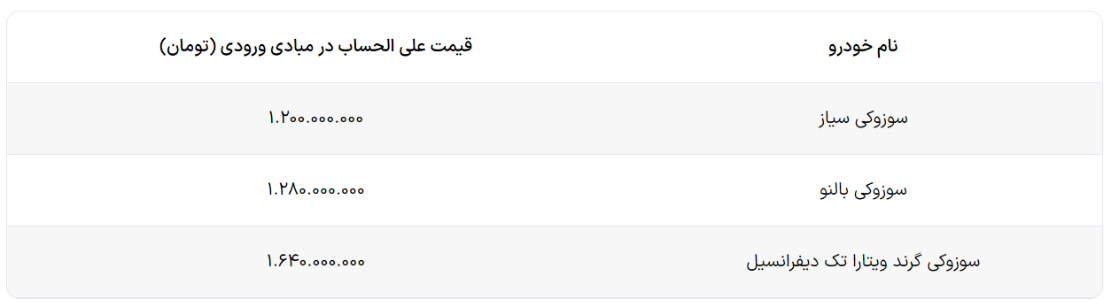 در حال حاضر سامانه خودروهای وارداتی قیمت علی الحساب سه مدل از محصولات سوزوکی را در مبادی ورودی کشور اعلام کرده است. باید در نظر داشت که پس از اعلام قیمت قطعی، هزینه های جاری شماره گذاری به بهای اعلام شده اضافه می گردد. علاقه مندان می توانند با مراجعه به بانک های منتخب حساب وکالتی خود را تا ۲۳ تیر ۱۴۰۳ افتتاح کنند. همچنین تا ۲۴ تیر این مهلت فراهم است تا خودروی مورد نظر خود را در سامانه انتخاب کنند.