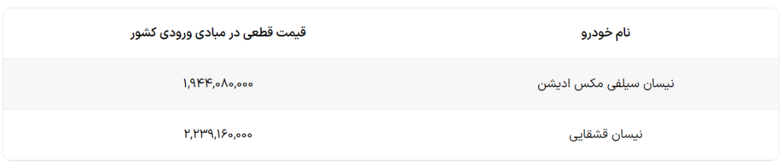 در حال حاضر قیمت قطعی در مبادی ورودی کشور دو محصول نامی خودرو به شرح زیر است: