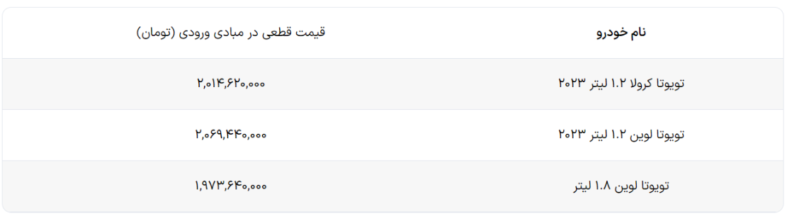 نکته دیگری که باید به آن توجه داشت این است که تویوتا لوین با پیشرانه ۱.۸ لیتری به دلیل بهره مندی از سیستم هیبرید تعرفه کمتری نسبت به نسخه های بنزینی تویوتا لوین و تویوتا کرولا داشته و به همین دلیل قیمت قطعی پایین تری نسبت به آنها دارد و در حال حاضر ارزان ترین محصولی است که شرکت معین خودر ایرانیان در این دوره عرضه می کند. در این میان تویوتا لوین با پیشرانه ۱.۲ لیتری توربوشارژ با اینکه مشخصات یکسانی نسبت به تویوتا کرولا ۱.۲ لیتری دارد، اما قیمت بالاتری نسبت به آن دارد و در حال حاضر گرانترین محصول معین خودرو در این دوره است.
