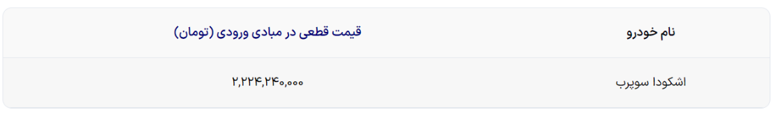 نا گفته نماند شخص متقاضی حتما باید شرایطی نظیر؛ سن بالای ۱۸ سال، داشتن گواهینامه فعال، عدم داشتن پلاک فعال با عمر کمتر از ۵ سال و عدم خرید خودرو از شرکت های سایپا و ایران خودرو و… را داشته باشد. در حال حاضر قیمت قطعی اشکودا سوپرب در مبادی ورودی کشور به شرح زیر است :