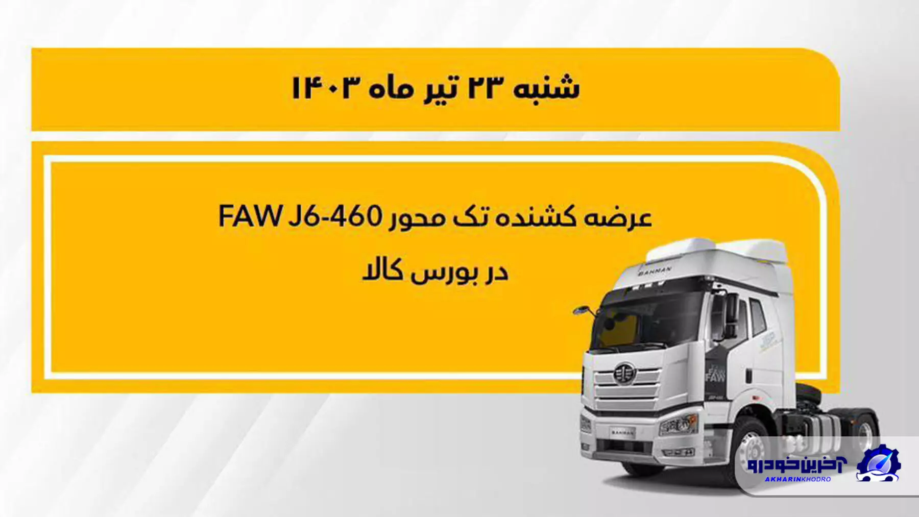 شرکت سیبا موتور از شرکتهای عضو گروه بهمن، کشنده تک محور فاو J6P-460 در بورس کالا عرضه میکند. این طرح فروش از ساعت ۹ صبح شنبه ۲۳ تیرماه ۱۴۰۳ تا پایان همان روز برگزار میشود.
