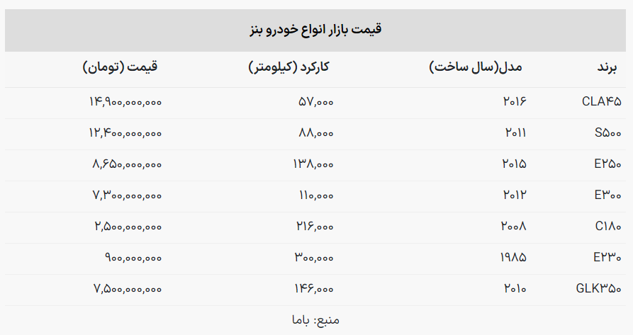 با مطالعه جدول زیر اطلاعات کاملی درباره قیمت روز انواع خودروهای بنز در بازار به دست خواهید آورد: