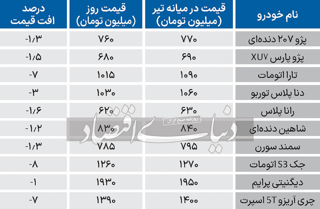 بیشتر خودروهای داخلی افت قیمت 10میلیون تومانی را نسبت به دوران قبل از برگزاری دور دوم انتخابات ریاستجمهوری تجربه کردهاند، هرچند در جمع مدلهای داخلی و مونتاژی، افت قیمتهای بالاتر نیز به چشم میآید.به عنوان مثال، پژو 207 دندهای 10 میلیون تومان کاهش قیمت داشته، اما تارا اتومات 75میلیون تومان افت قیمت داشته است. یا مثلا دیگنیتی پرایم افت قیمت 20میلیون تومانی در بازه زمانی تحت بررسی داشته، اما شاهین 10میلیون تومان کاهش قیمت را به خود دیده است.