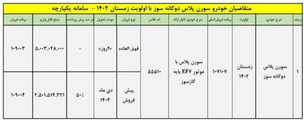 ایران جیب/ به استحضار میرساند شرایط انتخاب و واریز وجه به تعداد محدود برای متقاضیان خودرو سورن پلاس دوگانه سوز با اولویت زمستان 1402 سامانه یکپارچه مطابق جدول پیوست ایجاد شده است. لذا متقاضیان فوق میتوانند طی مدت 10 روز یا زمان تکمیل ظرفیت با مراجعه به سایت فروش اینترنتی ایران خودرو نسبت به واریز وجه اقدام نمایند.