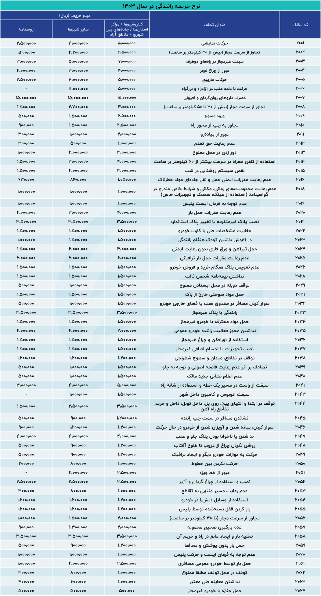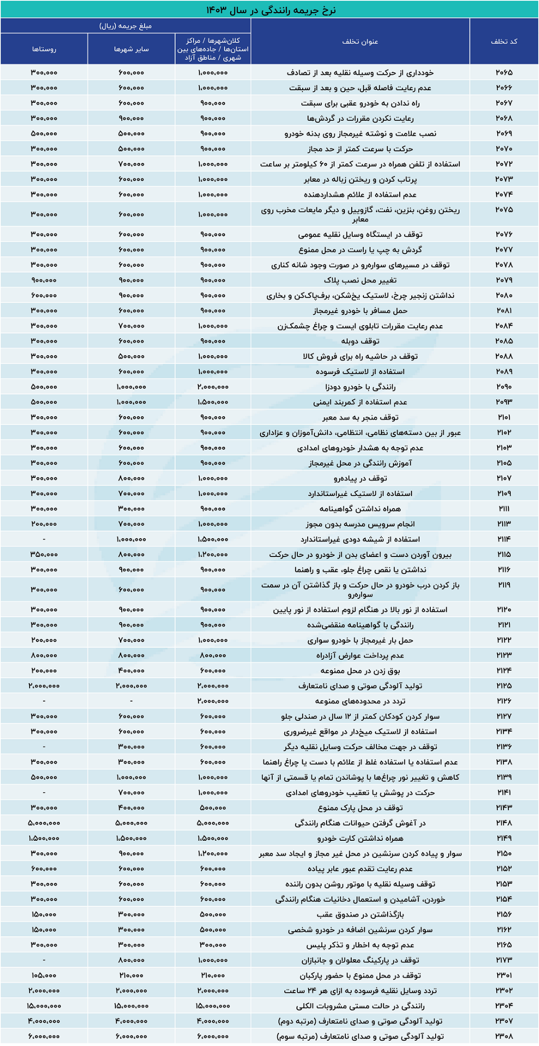 جدول تخلفات و مبلغ جریمه های جدید