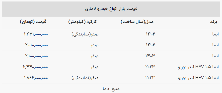 قیمت لاماری ایما مدل ۱۴۰۲ در بازار به قیمت ۲ میلیارد و ۱۰ میلیون تومان رسید.