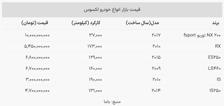 با مطالعه جدول زیر اطلاعات کاملی درباره قیمت روز خودروهای لکسوس به دست خواهید آورد: