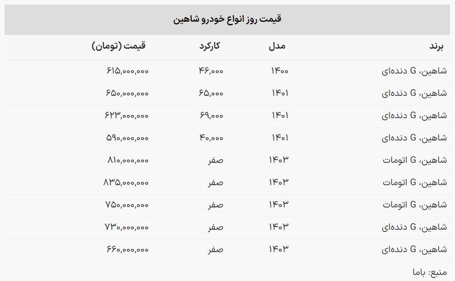 با مطالعه جدول زیر اطلاعات کاملی درباره قیمت روز خودروهای شاهین به دست خواهید آورد: