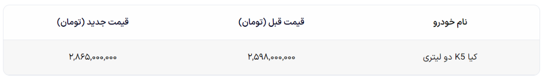 نا گفته نماند که قیمت قبلی کیا کی پنج ۲,۵۹۸,۰۰۰,۰۰۰ تومان بوده که اکنون با این افزایش قیمت، قیمت آن به ۲,۸۶۵,۰۰۰,۰۰۰ تومان رسیده است. نکته که در مورد این موضوع باید بدانیم این است که شرکت کوشا خودرو مجوز های لازم را برای افزایش قیمت این خودرو از سازمان حمایت مصرف کنندگان دریافت کرده است اما علت این افزایش قیمت را عنوان نکرده است که احتمال می رود افزایش قیمت کیا K5 دو لیتری به علت هزینه های واردات و گمرک باشد.