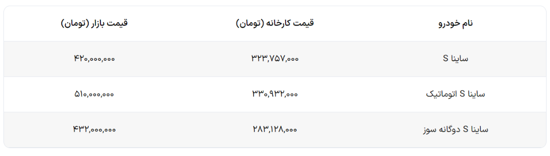 قیمت ساینا در هر تیپ تاریخ ۲۷ تیر ۱۴۰۳ :