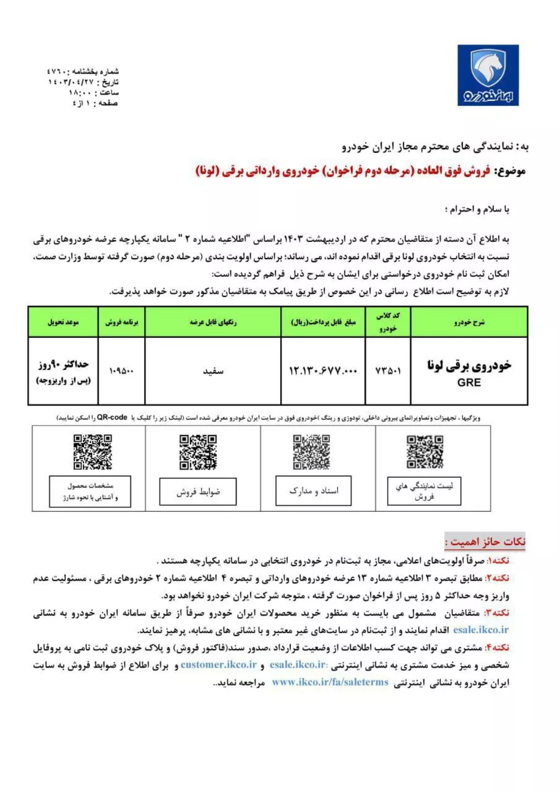 / فراخوان مرحله دوم خودروی وارداتی برقی لونا براساس اولویت بندی سامانه یکپارچه ویژه تیرماه ۱۴۰۳ اطلاع رسانی شد.