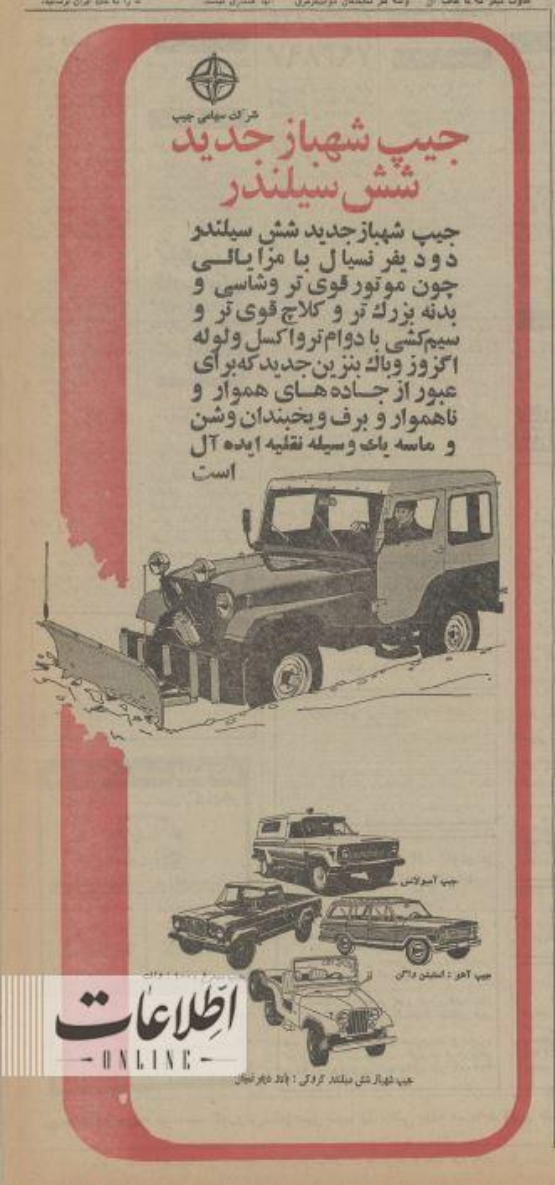 روزنامه اطلاعات ۲۵ تیر ۱۳۵۳ دو آگهی جالب از جیپ شهباز و ژیان از محصولات پر طرفدار این دو تولیدکننده را منتشر کرد.