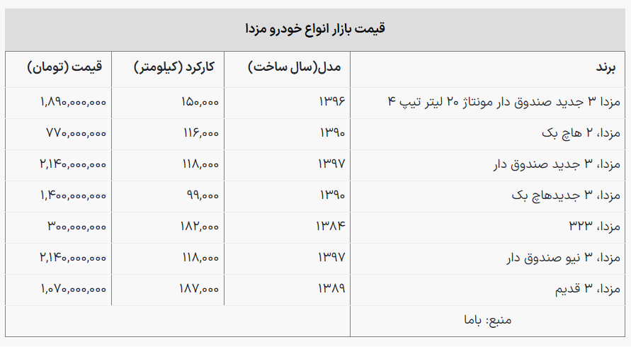 با مطالعه جدول زیر اطلاعات کاملی درباره قیمت روز انواع خودروی مزدا به دست خواهید آورد