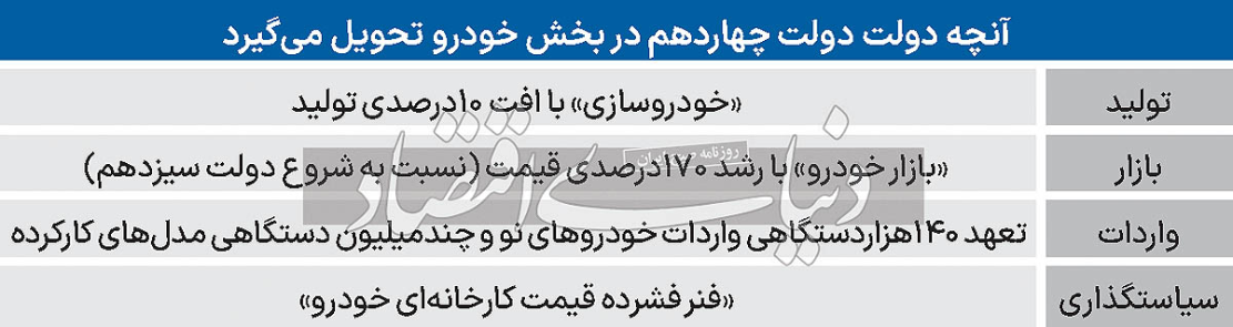 در مجموع، دولت چهاردهم صنعت خودرو را در شرایطی که هم تولید و کیفیت آن نزولی شده، از دولت فعلی تحویل میگیرد و علاوه بر آن، باید به تعهدی چندصدهزاردستگاهی (بهجامانده از دو مرحله فروش یکپارچه بزرگ خودرو) نیز در شرایط افت تولید، عمل کند.